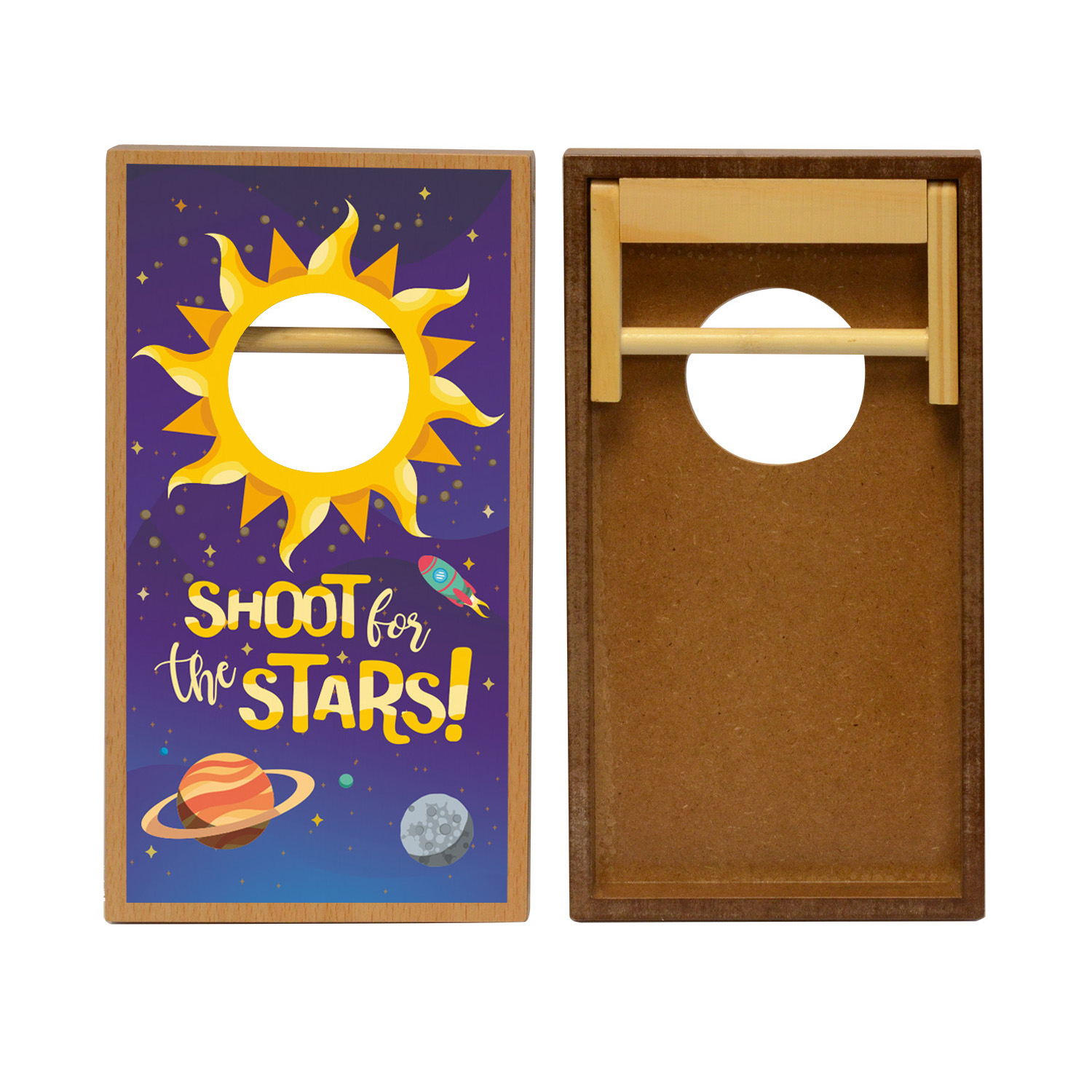 The Fun On The Go Games – Corn Hole includes 2 game boards and 6 sand-filled bags, rated for ages 6 and up. 13.5″ H x 3.5mm Thick